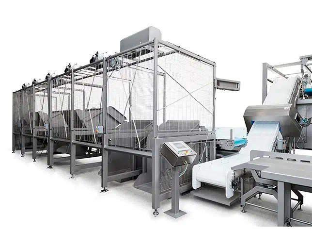 One option in the scansteel foodtech® “batching family of solutions” is a station of typically 2 – 8 swing loaders (tippers) which can hold different meat raw material.