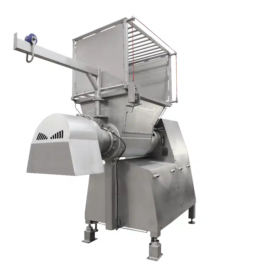 Der SuperGrind 400/260 ist komplett montiert und produktionsbereit. Er verfügt über einen Sicherheitskäfig, der verhindert, dass rohes Fleisch, wie z. B. gefrorene Blöcke, beim Befüllen des Wolfes herausgeschleudert wird.